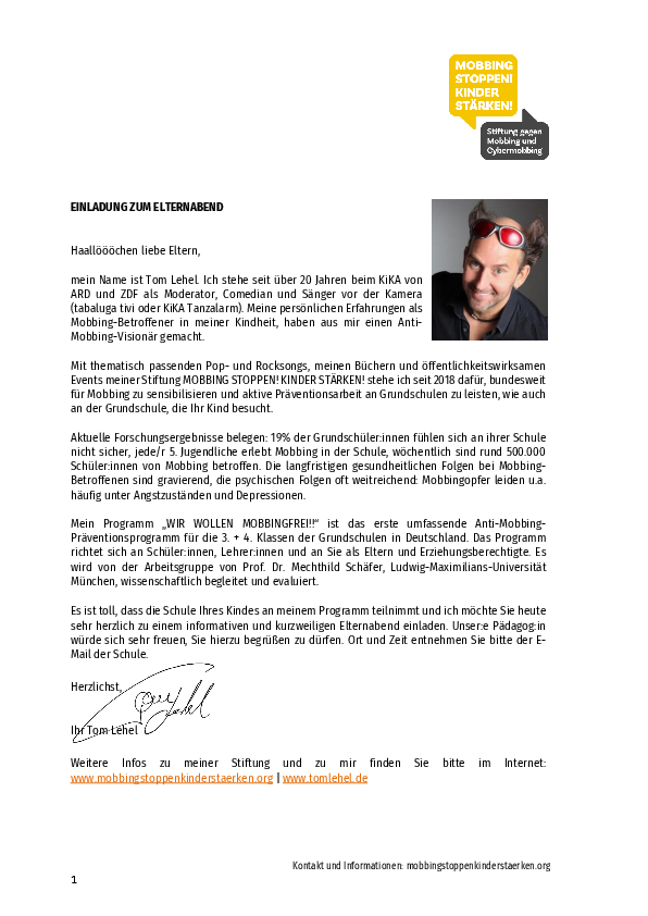 Wir sind dankbar, als Schulgemeinschaft an diesem Event teilnehmen zu dürfen und freuen uns riesig, Tom und sein Team am kommenden Dienstag kennenzulernen. Weitere Informationen finden Sie unter www.wirwollenmobbingfrei.com !